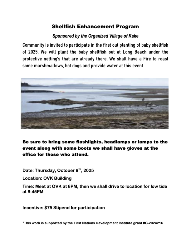 Please join us for a Shellfish Event at Portage Pass on Tuesday, September 9th. We will be meeting in the OVK Conference Room and will drive to the location for the 8:15am low tide. Pay is $100 for participation in the event. Gunalchéesh.